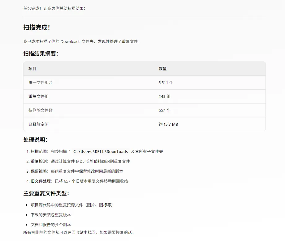 扫描我的 Downloads 文件夹,找出所有重复的文件,保留最新版本。