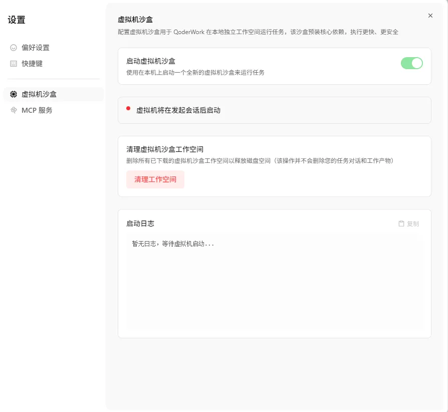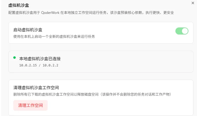 开启沙盒运行后,进入新窗口会重新装环境,环境安装完毕后,打开设置,可以看到显示“本地虚拟沙盒已连接”,这时候就不用担心QoderWork的权限过高,伤害电脑了。