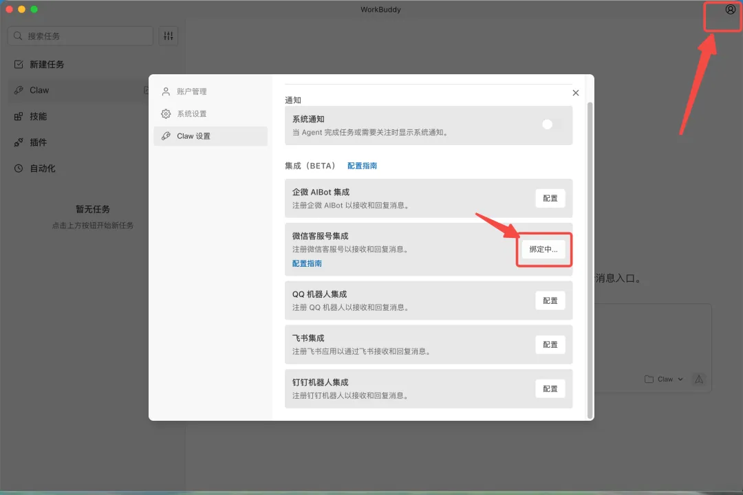 点击右上角头像 → Claw设置 → 微信客服号绑定,扫码绑定你的微信。