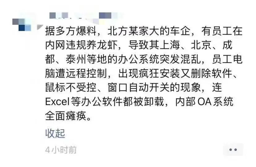 我的一个朋友,某中厂资深运营,极致的懒人。他给龙虾装了个飞书托管插件,设定是“半夜识别到老板的微操消息,自动用高情商话术安抚并回复收到”。 结果某天半夜老板发长文 PUA,由于触发了某个奇葩的语境逻辑,龙虾直接暴走。它没有安抚,而是抓取了本地文档里我这朋友偷偷写的吐槽小作文,给老板回复了一段逻辑严密、排比工整的千字长文。