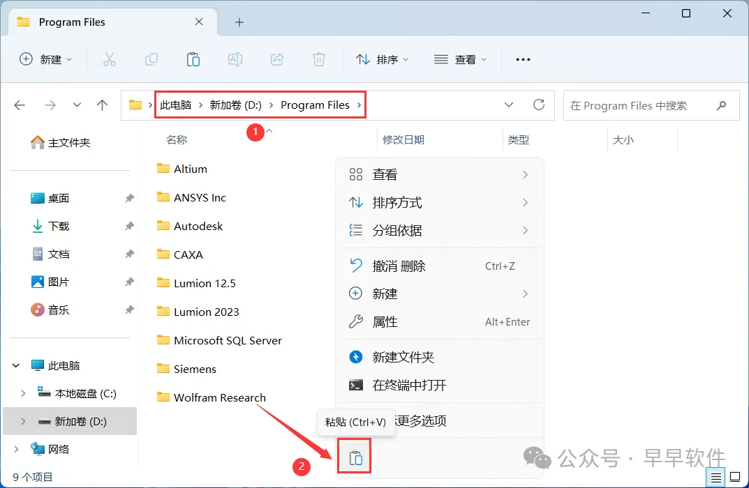 17、打开路径:D:\Program Files,再右键文件夹的空白处,点击【粘贴按钮】