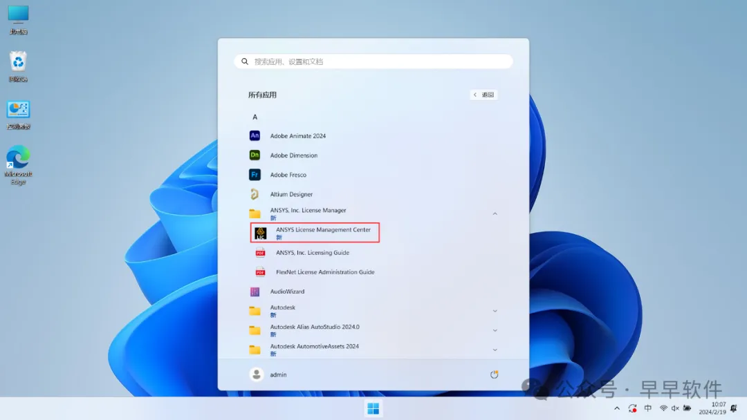 19、回到桌面,点击任务栏的【开始菜单】,在【所有应用】中找到【ANSYS Lincense Management Center软件图标】,点击打开软件