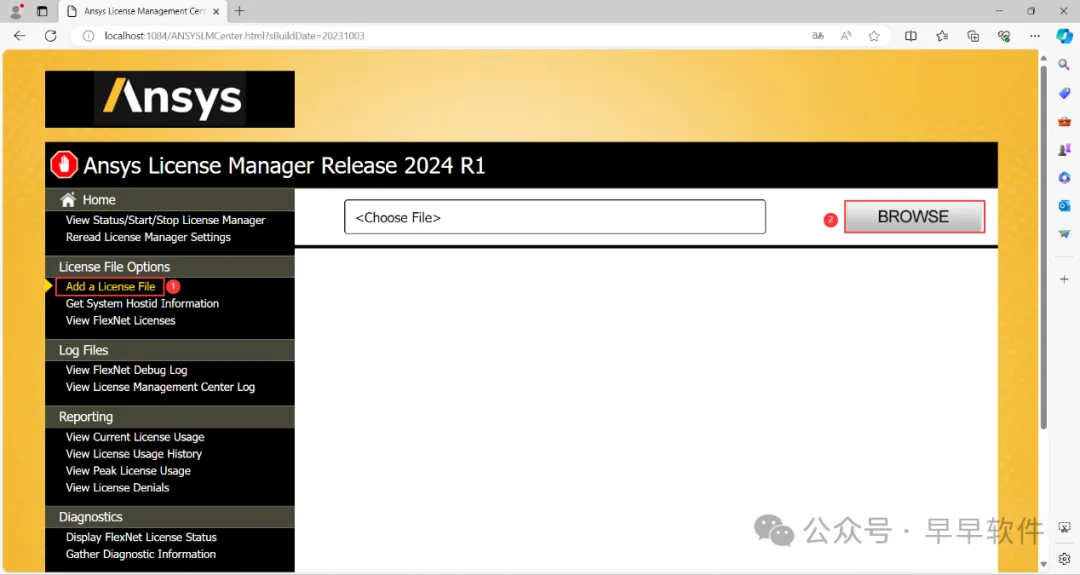 25、回到浏览器界面,点击左侧的【Add a License File】,再点击【BROWSE】