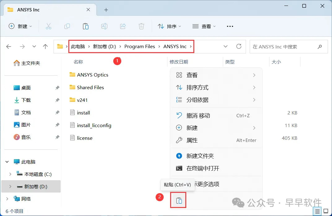 53、打开路径:D:\Program Files\ANSYS Inc,再右键文件夹的空白处,点击【粘贴按钮】
