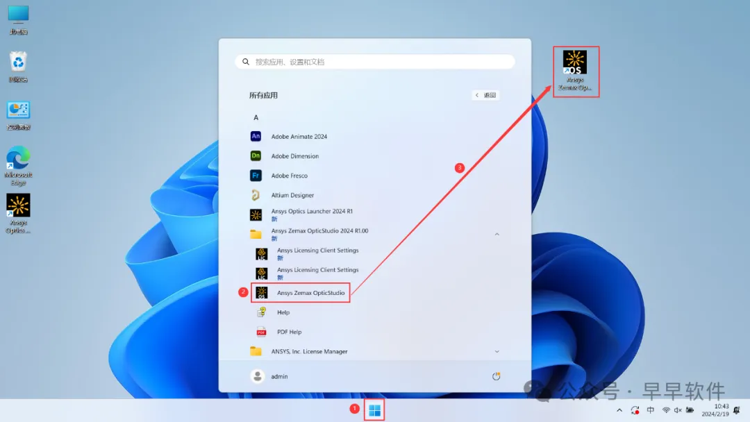 56、回到桌面,点击任务栏的【开始菜单】,在【所有应用】中找到【Ansys Zemax OpticStudio软件图标】,将软件图标拖到桌面上,完成软件桌面快捷方式的创建