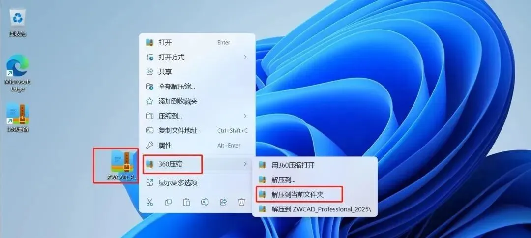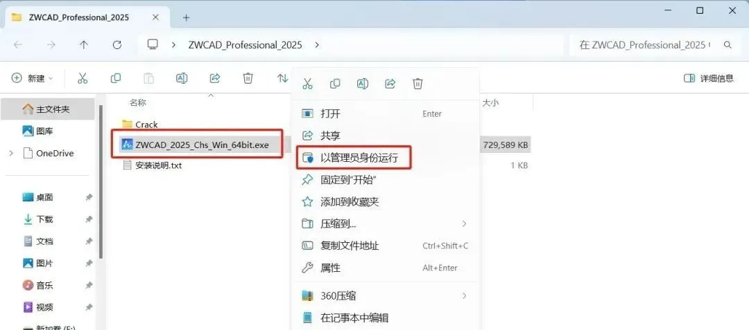 2.解压之后你可以得到CAD安装包和一个dll文件。那我们先开始安装软件。选中“ZWCAD_2025_Chs_Win_64bit.exe”(你的系统不一定显示文件扩展名),右键,以管理员身份运行