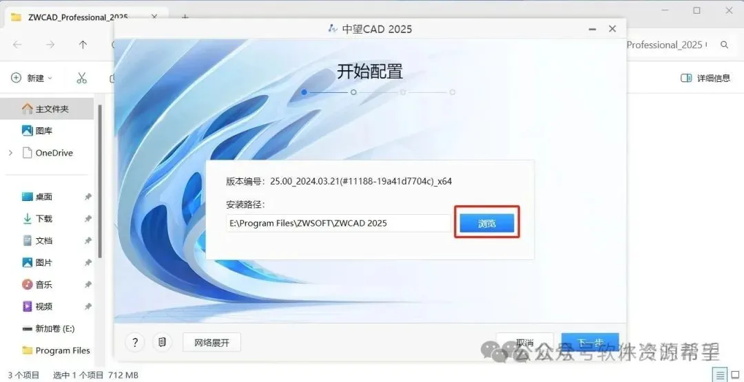 3.现在已经打开安装向导界面了,那第一个界面就是让你选择一个安装位置,如果你不希望把它安装在C盘,你可以点击右边的“浏览”按钮选择一个安装位置,但是你要注意,自己的整个路径不能出现任何中文或者其他非法字符,否则以后使用可能会出现问题的。设置好安装路径之后,你还需要记住这个路径,后面我们还需要到该位置替换文件,比如说我这里是“E:\Program Files\ZWSOFT\ZWCAD 2025”,然后点击“下一步”按钮