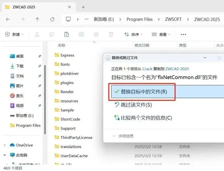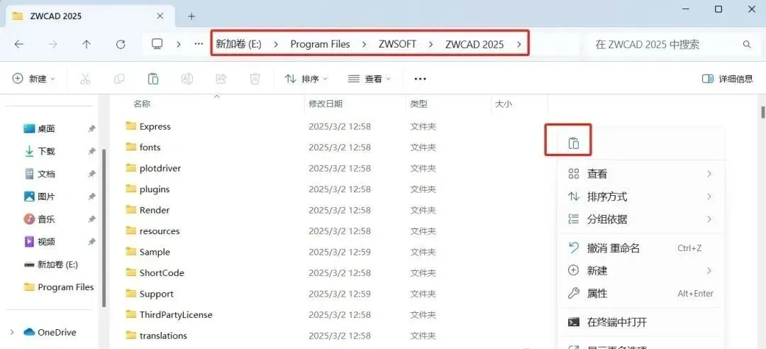 9.然后进入到你的CAD软件安装目录,比如说我这里是“E:\Program Files\ZWSOFT\ZWCAD 2025”,找个空白的地方,右键,粘贴