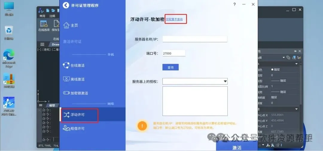 13.先点击左下角的“浮动许可”,再点击“仅配置不查询”按钮