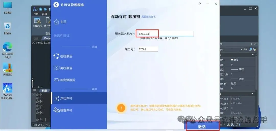 14.然后在“服务器名称/IP”那里输入“127.0.0.1”,端口号输入“27000”(一般来说它默认就是这个),然后点击“激活”按钮
