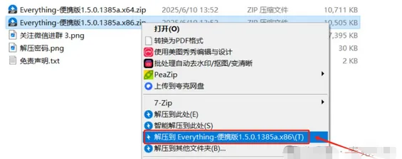 1.打开下载好的文件夹,找到适合你系统版本的压缩包,鼠标右键选择【解压到Everything-便携版1.5.0.1385a.x86\】。
