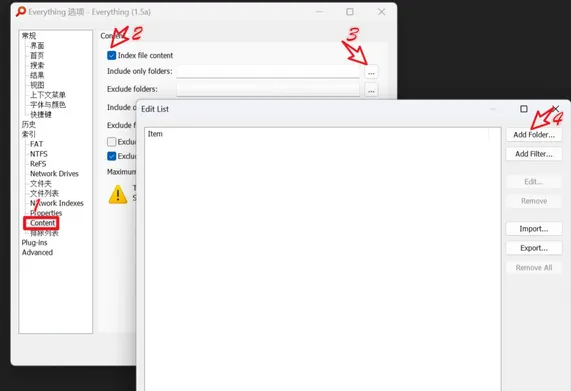 6,然后找到左边栏的【Content】,选择【Index file content】,再点三个点,最后点【Add Folder】。