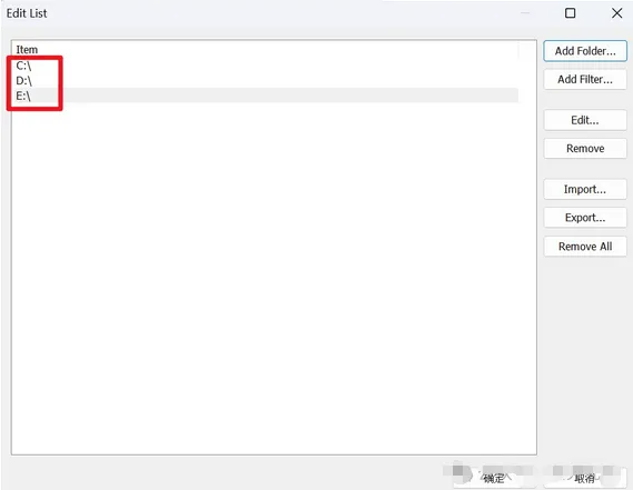 7,这里要加入我们搜索的磁盘,我这里有三个磁盘空间,分别是C、D、E盘,我就得添加三次,大家有几个磁盘就添加几次,根据自己的实际情况进行添加操作(添加完全以后记得点【确定】按钮)。