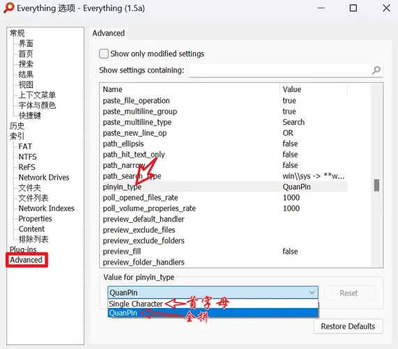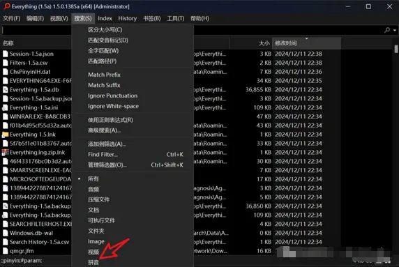 11,设置完成之后,我们在【搜索】处就可以看到“拼音”这一项了,选择它,我们就能实现拼音搜索。