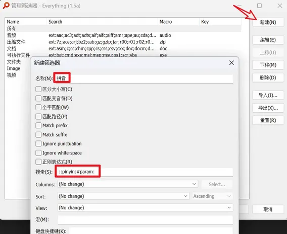 10,点“新建”,名称这里填写“拼音”,搜索处填“::pinyin:#param:”,填完后同样记得点“确定”。