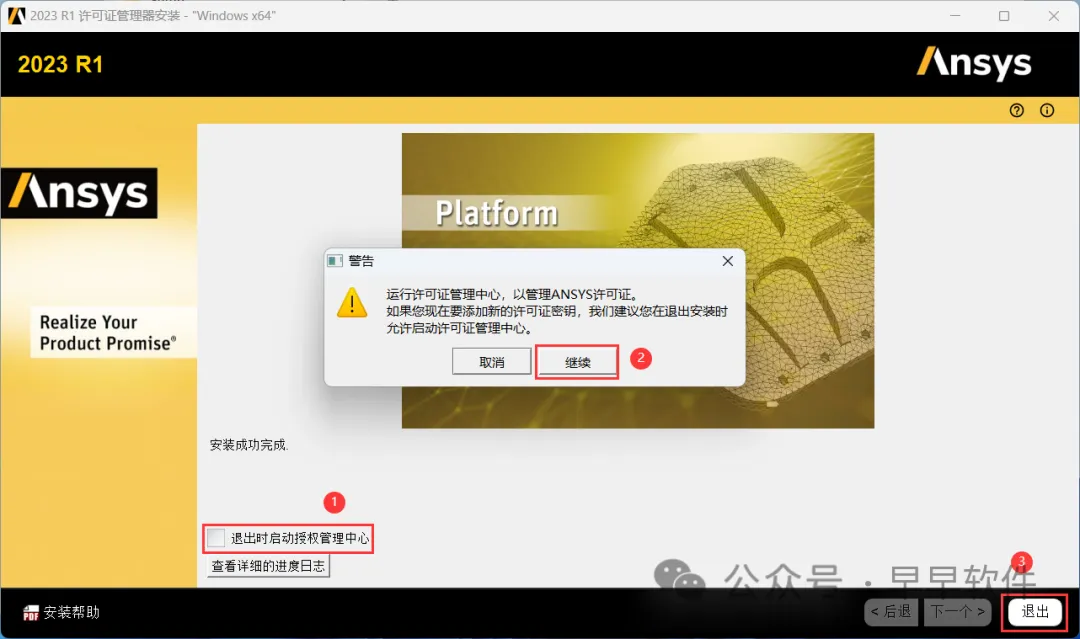 13、不勾选【退出时启动授权管理中心】,点击【继续】,再点击【退出】
