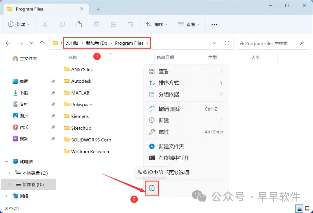 17、打开路径:D:\Program Files,再右键文件夹的空白处,点击【粘贴按钮】