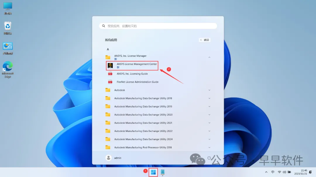21、回到桌面,点击任务栏的【开始菜单】,在【所有应用】中找到【ANSYS Lincense Management Center软件图标】,点击打开软件