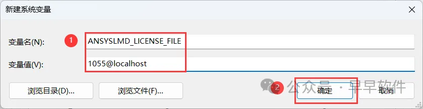 33、变量名输入:ANSYSLMD_LICENSE_FILE;变量值输入:1055@localhost,再点击【确定】