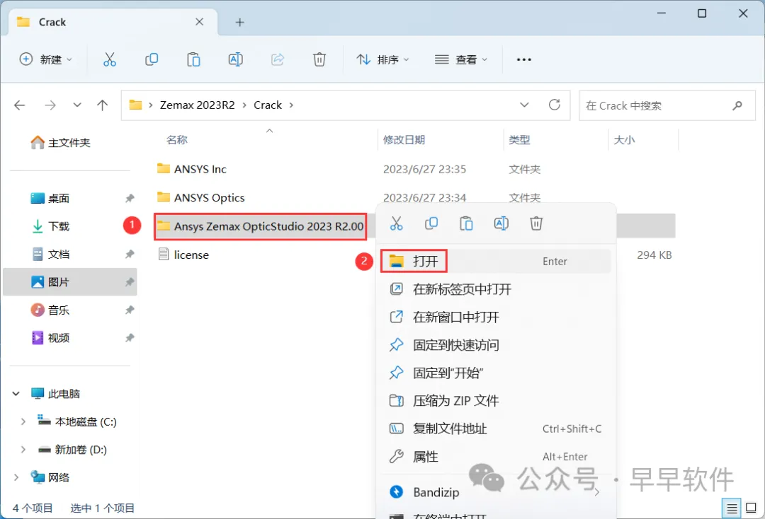 42、回到Crack文件夹,找到【Ansys Zemax OpticStudio 2023 R2.00】文件夹,右键【打开】它