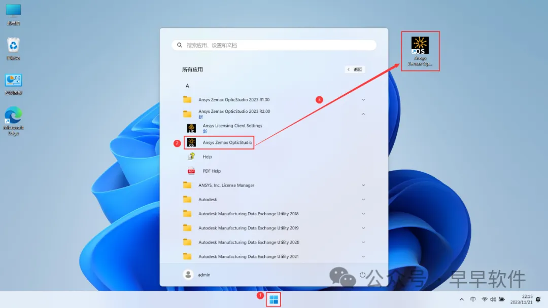 44、回到桌面,点击任务栏的【开始菜单】,在【所有应用】中找到【Ansys Zemax OpticStudio软件图标】,将软件图标拖到桌面上,完成软件桌面快捷方式的创建