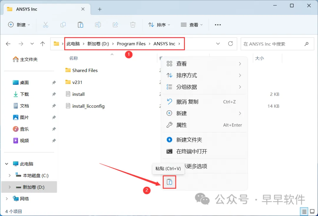 49、打开路径:D:\Program Files\ ANSYS Inc,再右键文件夹的空白处,点击【粘贴按钮】