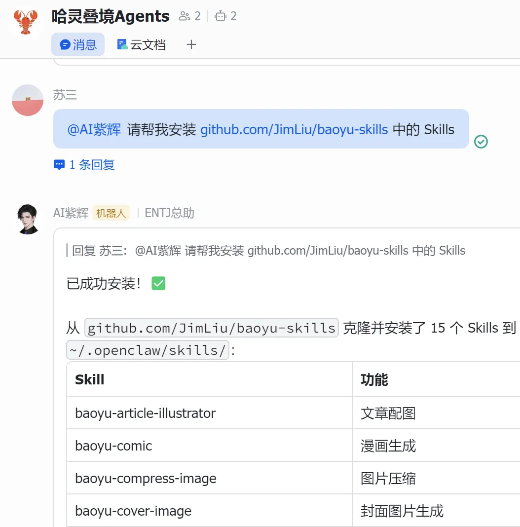 推荐baoyu大佬的skills,配图很精美,直接在主Agent中发送如下对话。