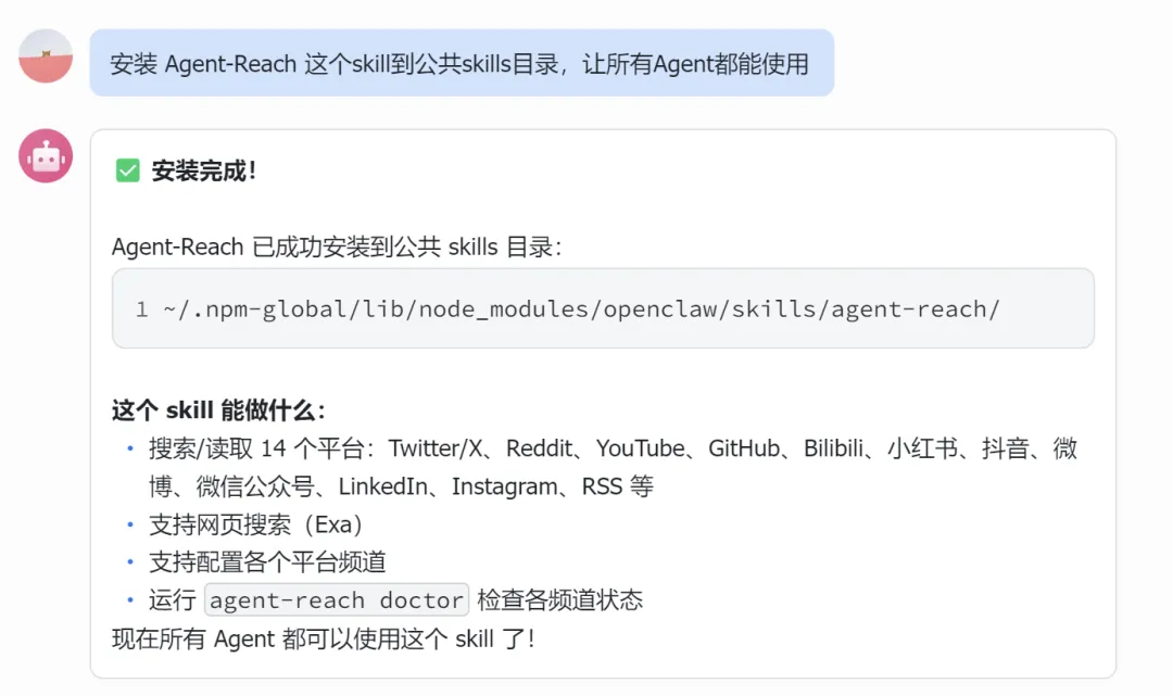 (可以强调一下,安装在公共skills目录,这样就能让所有Agent使用,并且让Agent记录工具应用,这样下次就不会忘了。)