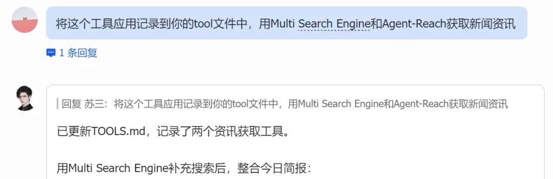 安装 Agent-Reach 这个skill到公共skills目录,让所有Agent都能使用将这个工具应用记录到你的tool文件中,用Multi Search Engine和Agent-Reach获取新闻资讯