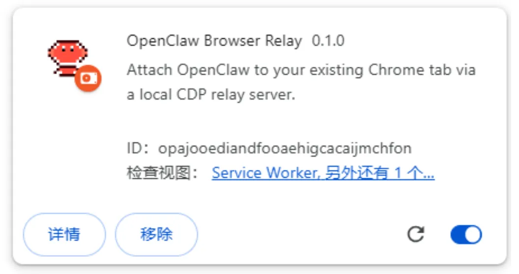 1.打开chrome安装扩展程序:OpenClaw Browser Relay。(需要梯子)