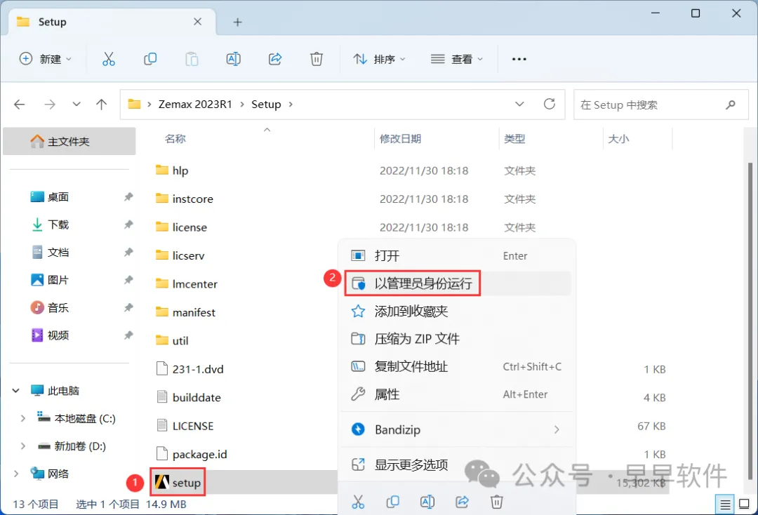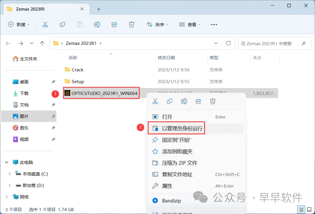 40、回到Zemax 2023R1文件夹,找到【OPTICSTUDIO_2023R1】应用程序,右键选择【以管理员身份运行】它
