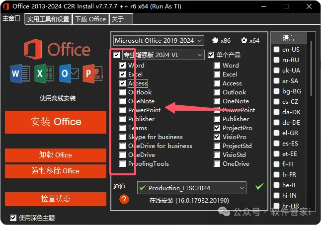 4. 请挑选您需要的版本和相应的Office套件(请注意,Standard 2024版本不可安装)。