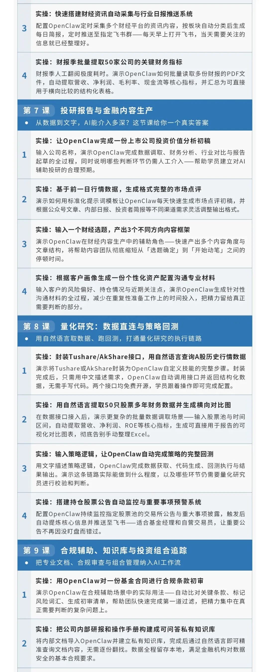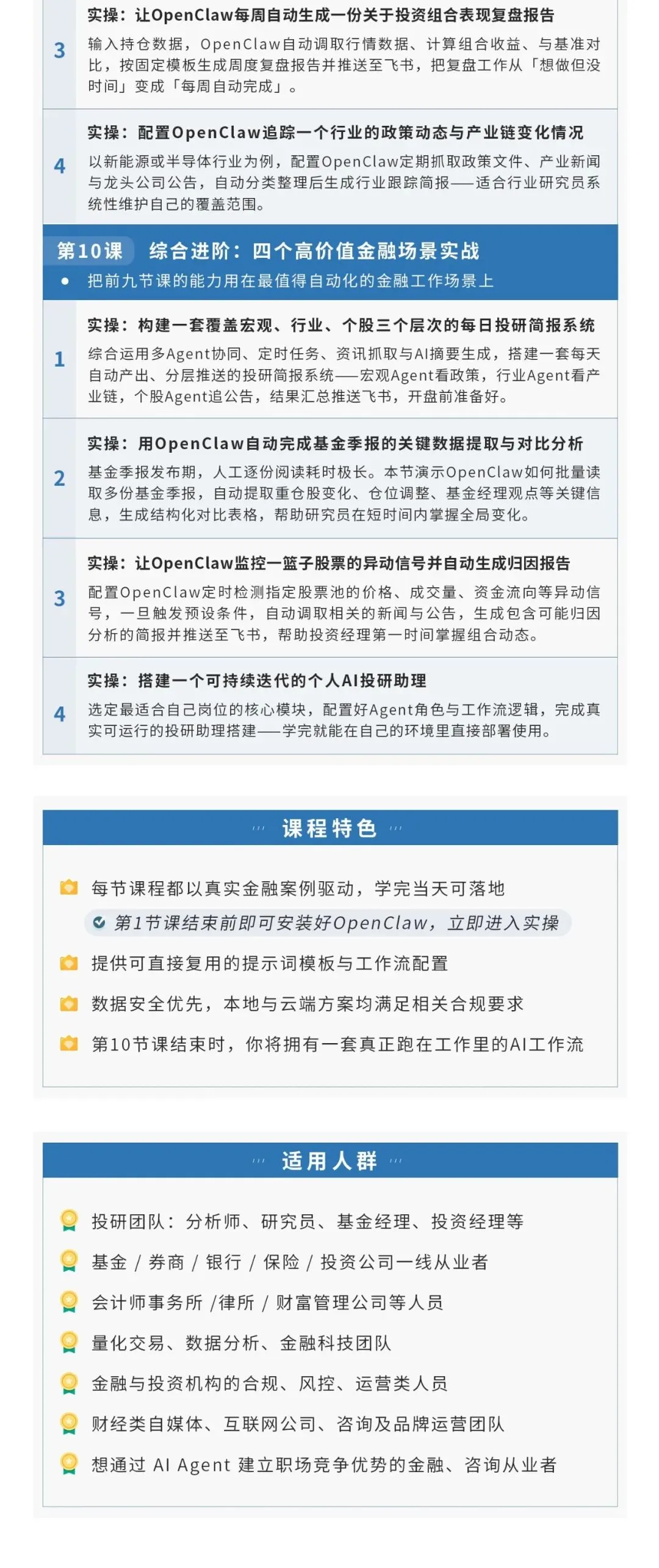 为了让更多的人能够快速使用OpenClaw实操应用,华尔街学堂邀请资深专家开设《OpenClaw-入门到精通》专题课。将结合案例操作演示,手把手带领大家轻松玩转OpenClaw。本课程为金融从业人员量身定制,10节课循序渐进,每节课围绕真实金融案例展开,从零安装到量化回测全链路覆盖,学完当天就能把OpenClaw用进自己的工作流。