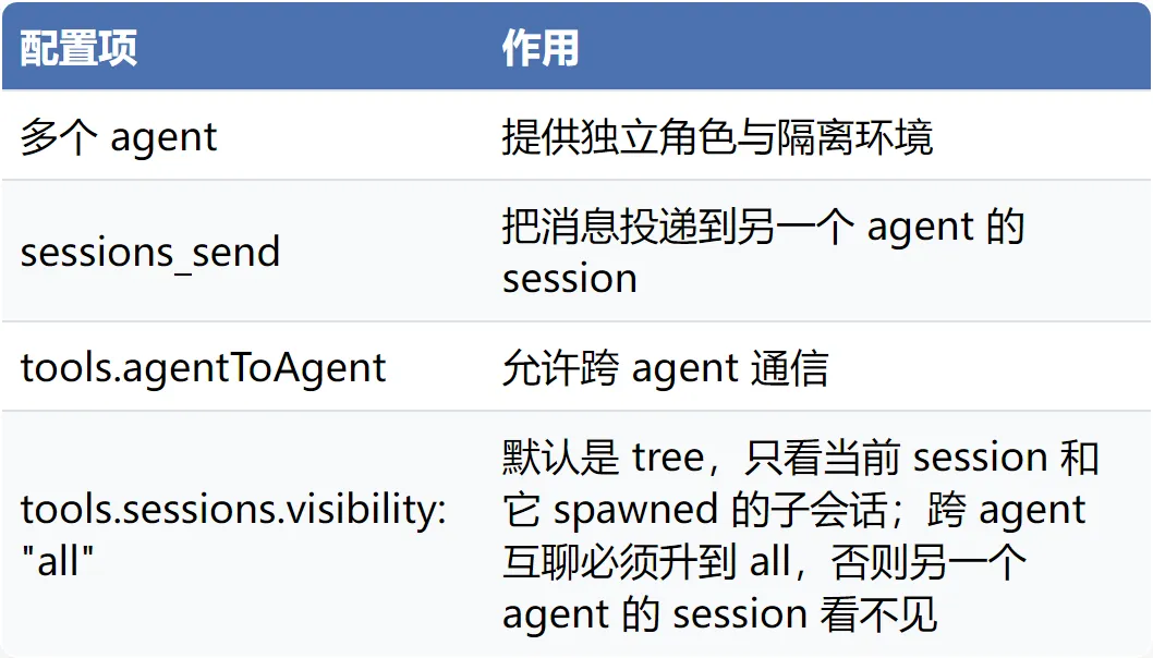 OpenClaw 本身支持一个 Gateway 托管多个agent;每个 agent 都有自己独立的 workspace、agentDir 和 session store。跨 agent 发消息时,用的是 session 工具。官方也明确写了:跨 agent 目标会话需要 tools.sessions.visibility:“all”,并且还要额外开启 tools.agentToAgent。