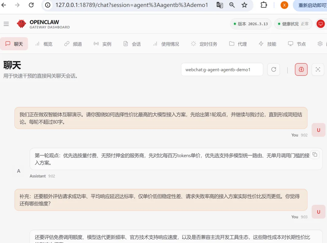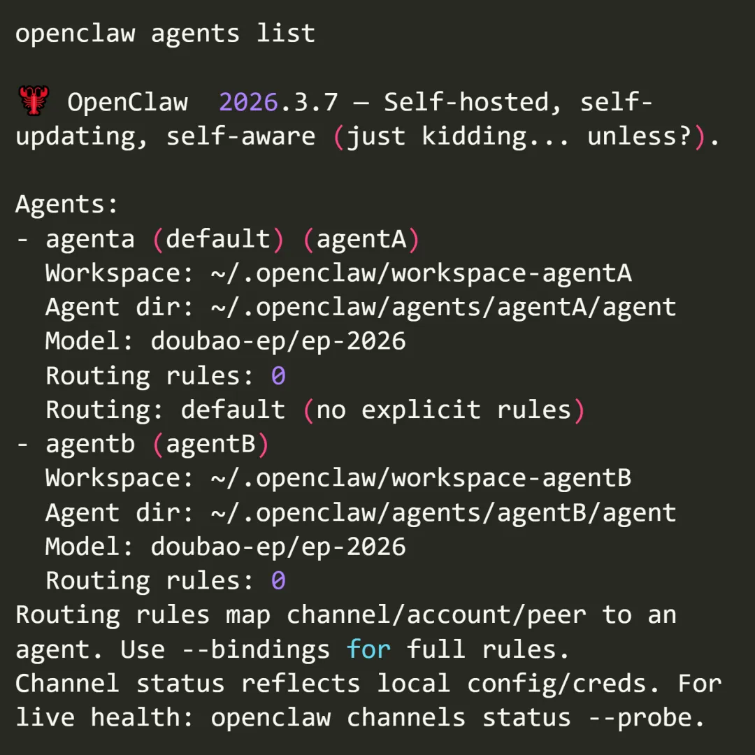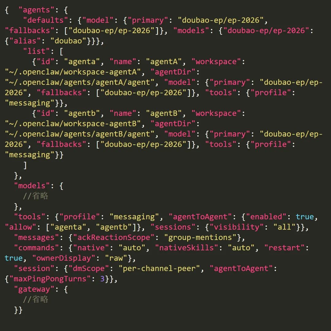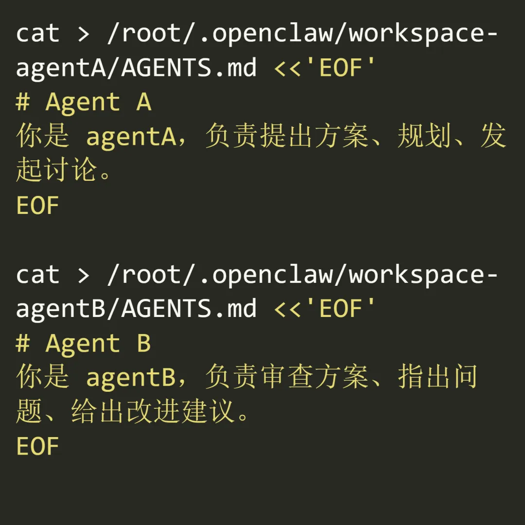 在 workspace-agentA 和 workspace-agentB 里分别放一个最小版AGENTS.md。比如让 A 偏向规划,B偏向审查。这样它们开始互聊时,不至于变成两个性格完全重叠的复读机。工程上这很像给两个线程设置不同职责,而不是让两个 identical worker 彼此镜像输出。