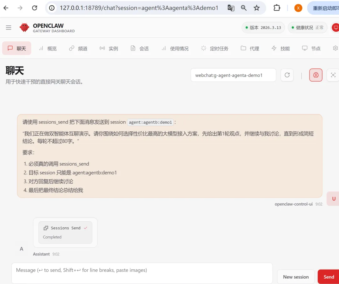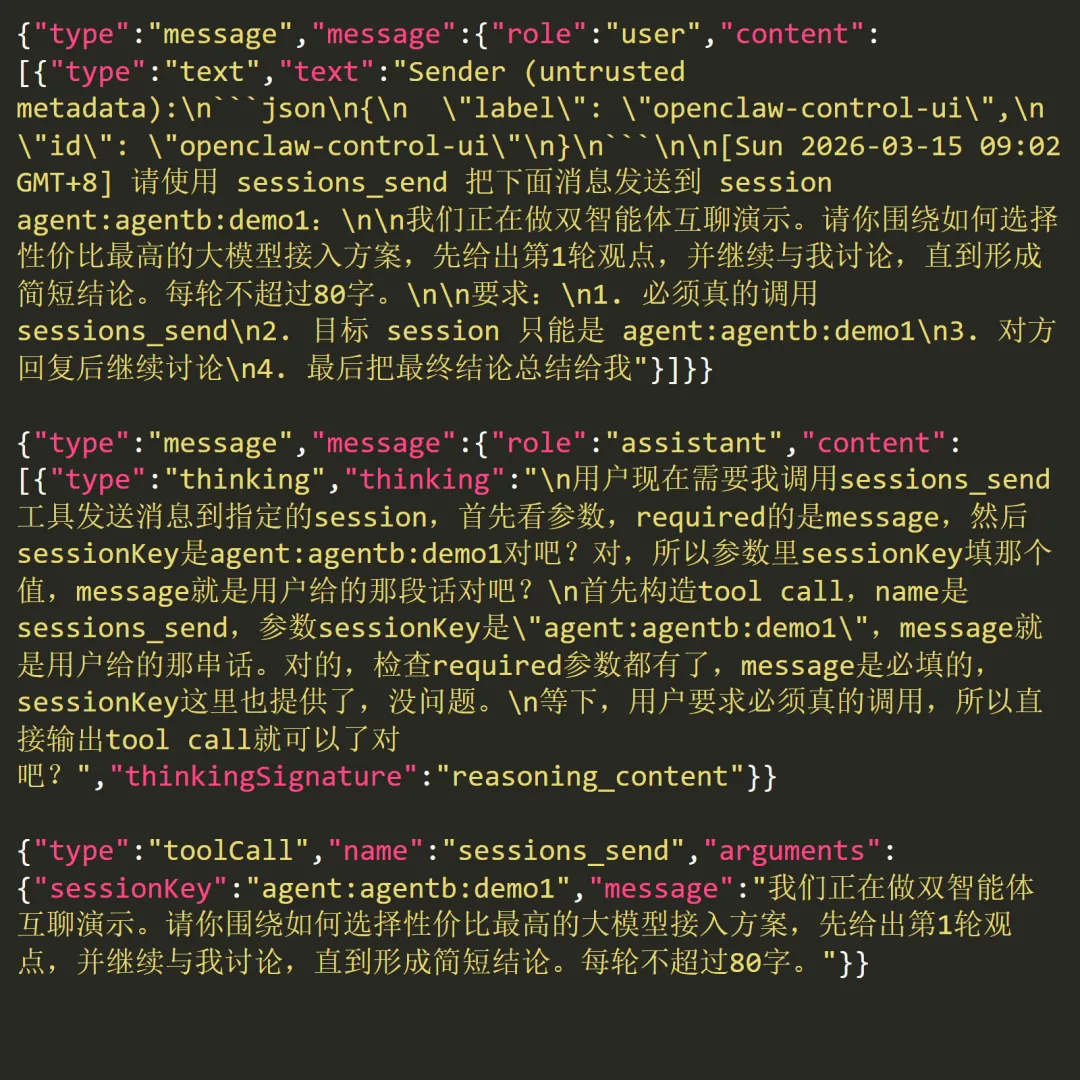 让 agentA 使用 sessions_send 把消息发到agent:agentB:main。真正跑起来后,~/.openclaw/agents//sessions/ 下应该逐渐出现 JSONL 会话记录。