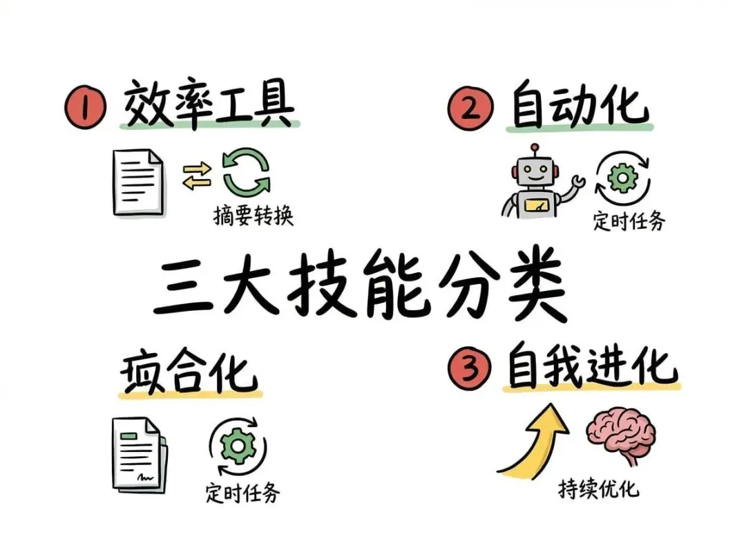 今天就来聊聊 11 个让 OpenClaw 真正武装起来的核心技能,分成效率工具、自动化和自我进化三大类,帮你快速上手。