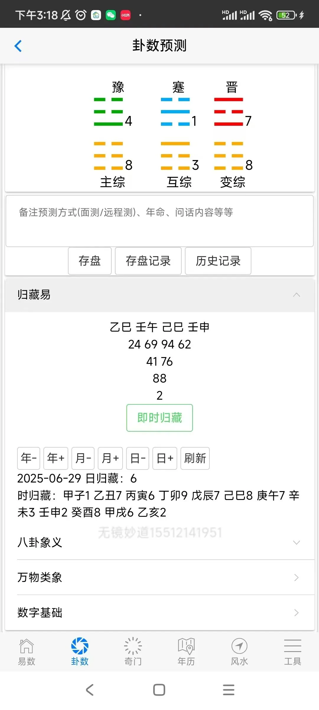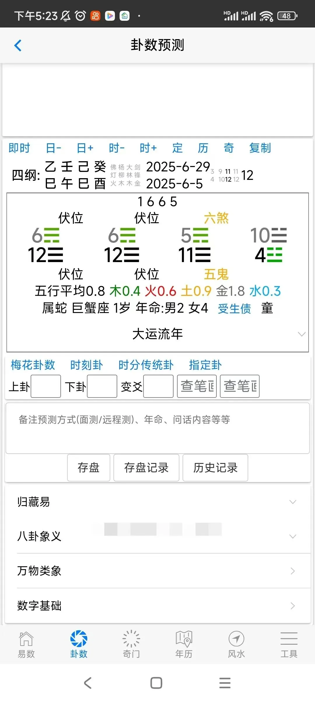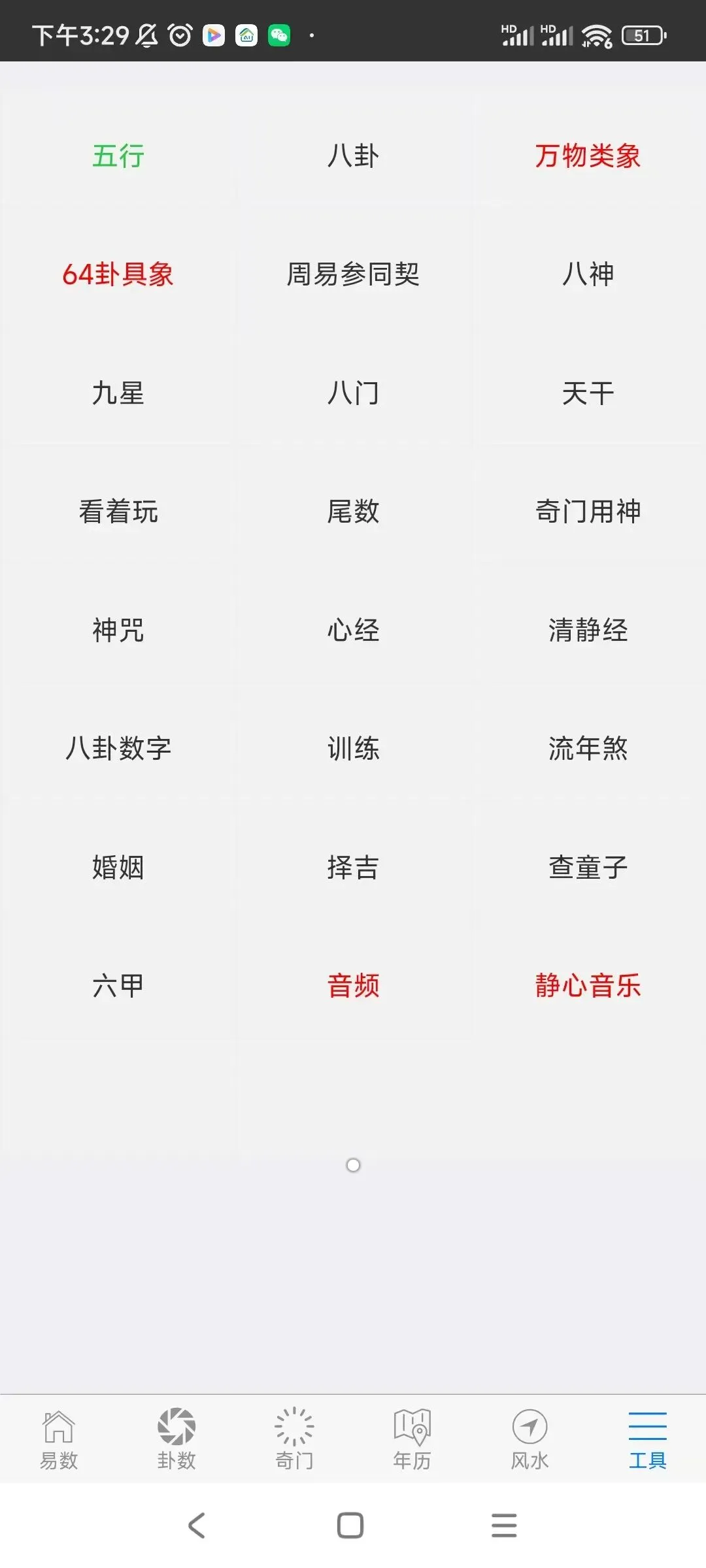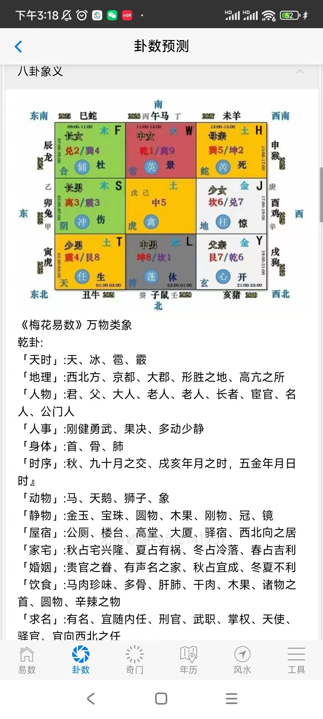 ⑥工具包括:五行、八卦、万物类象、64卦具象、周易参同契、八神、九星、八门、天干、看着玩、尾数、奇门用神、神咒、心经、清静经、八卦数字、训练、流年煞、婚姻、择吉,查童子,六甲,音频,佛门静心音乐,手机号码预测,归藏易预测,康熙字典等内容。