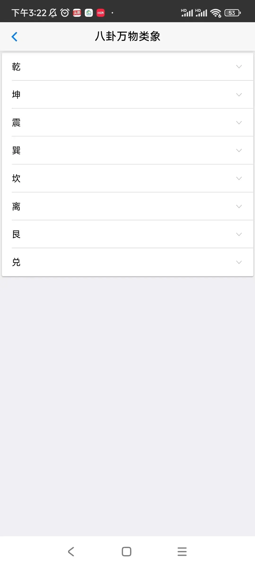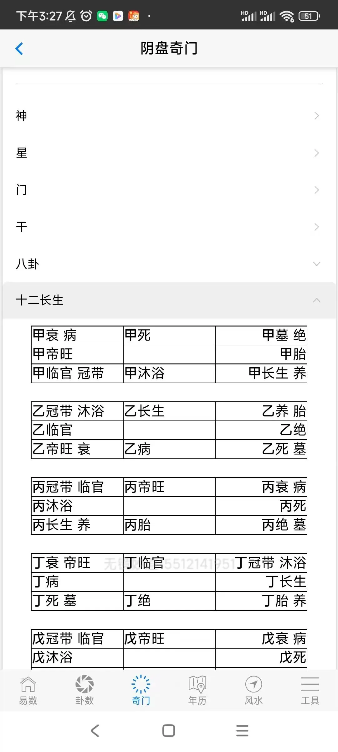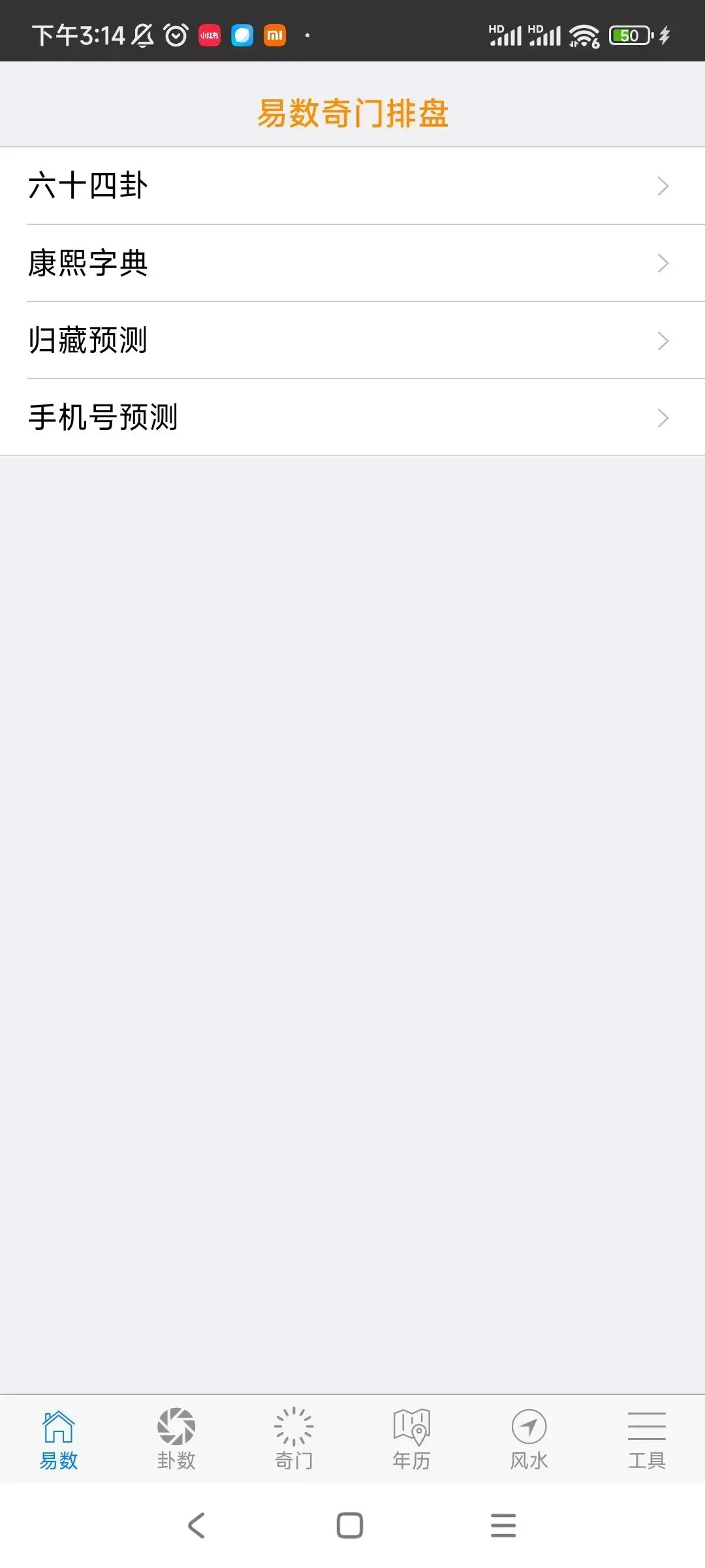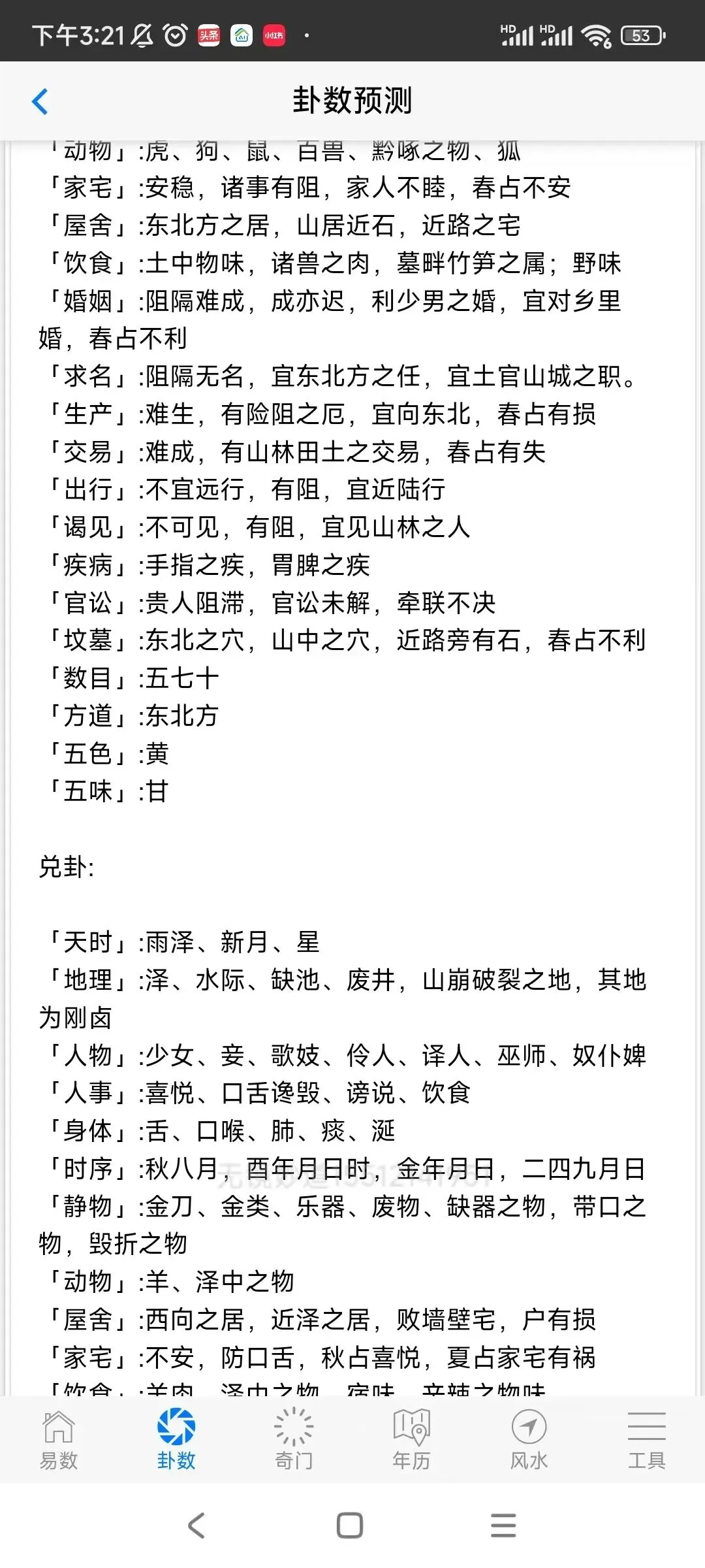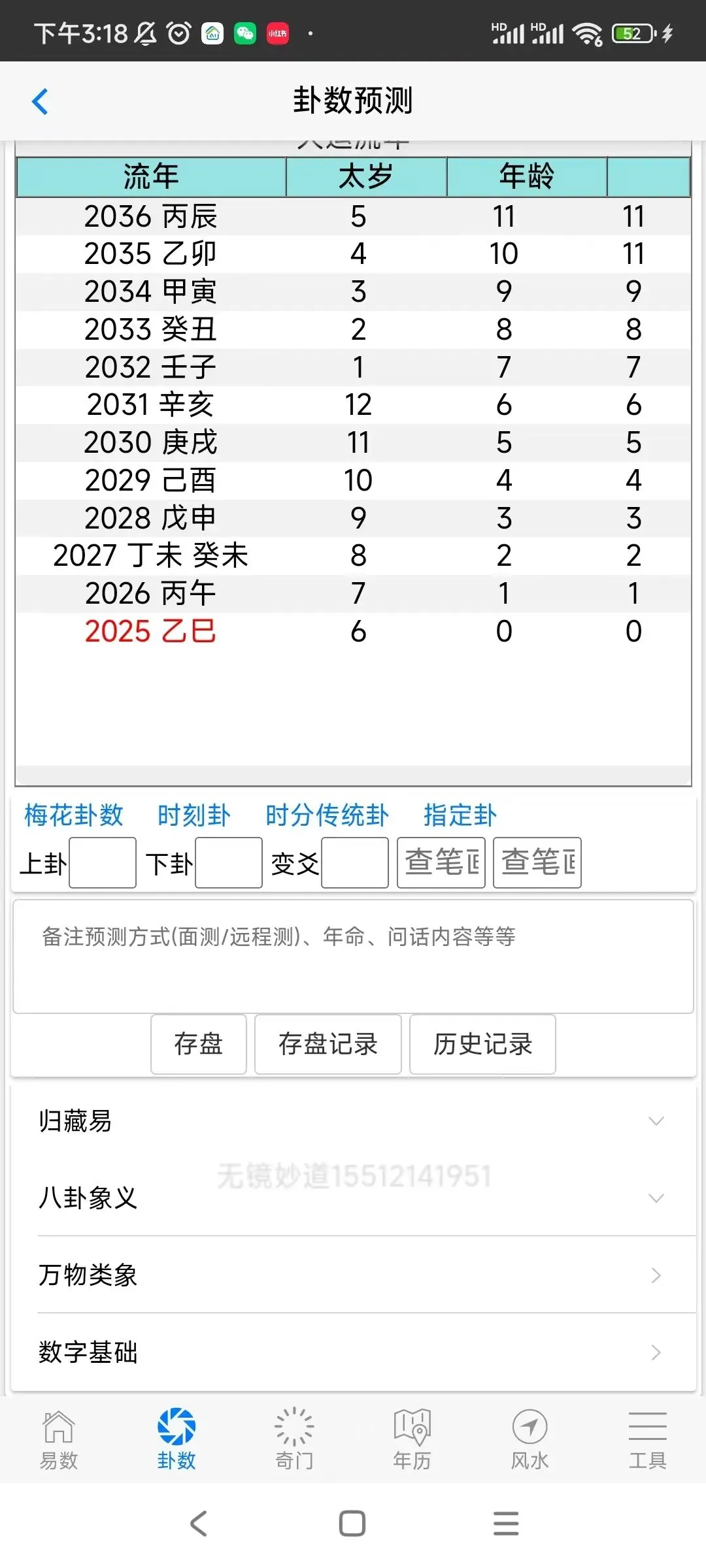 ⑥工具包括:五行、八卦、万物类象、64卦具象、周易参同契、八神、九星、八门、天干、看着玩、尾数、奇门用神、神咒、心经、清静经、八卦数字、训练、流年煞、婚姻、择吉,查童子,六甲,音频,佛门静心音乐,手机号码预测,归藏易预测,康熙字典等内容。