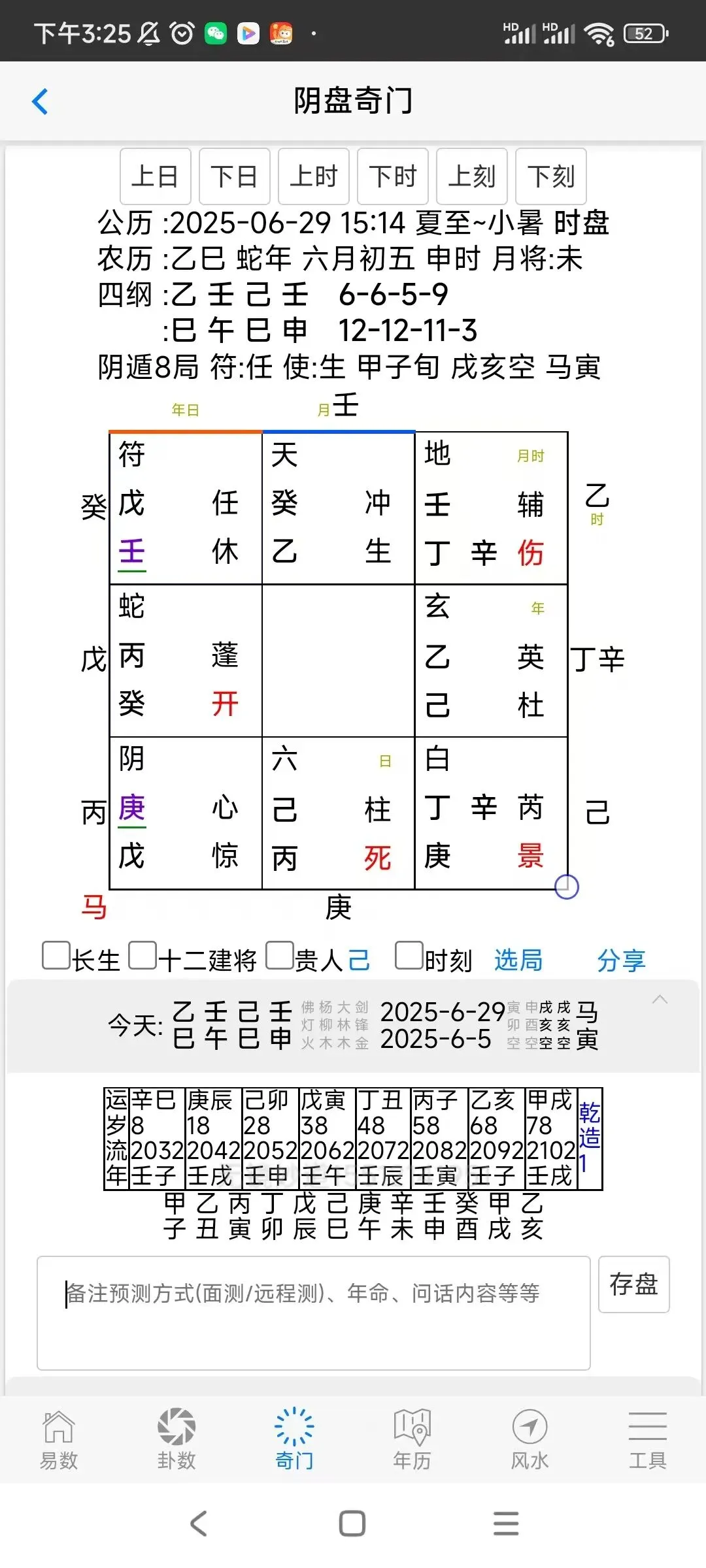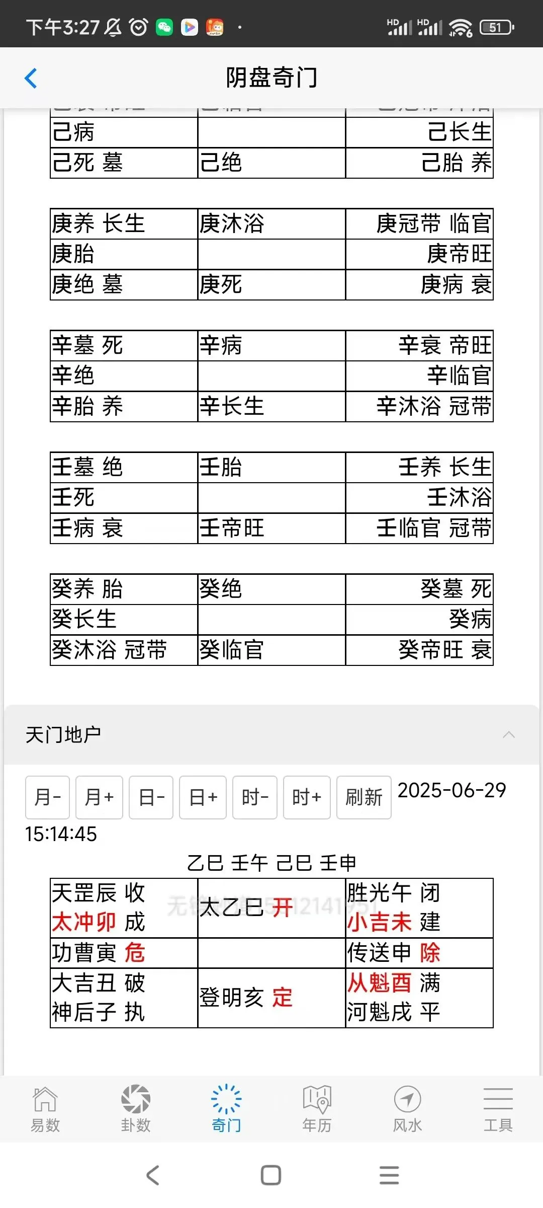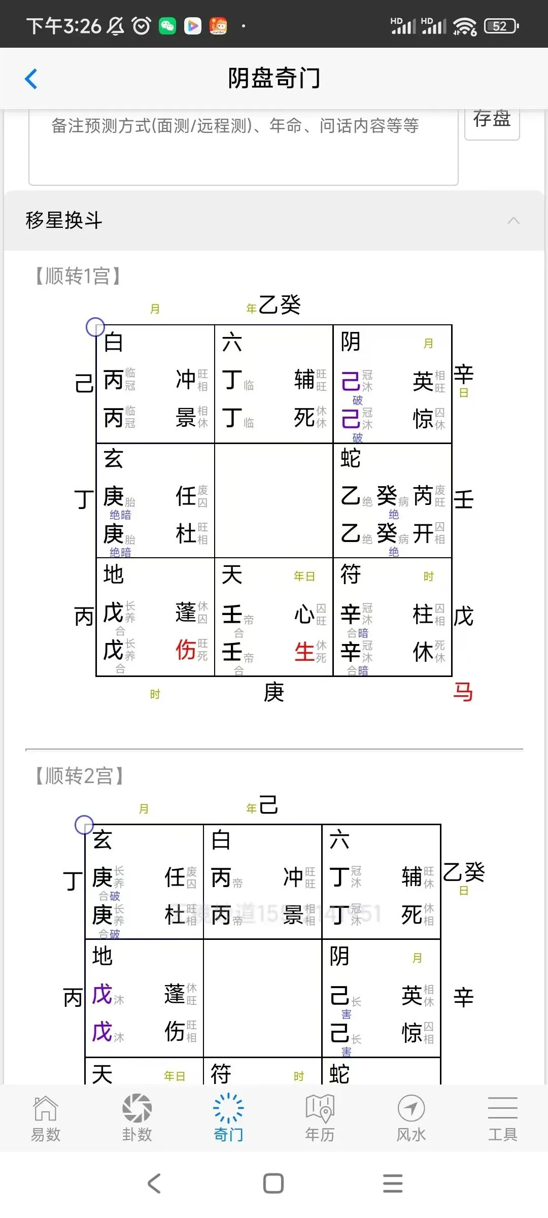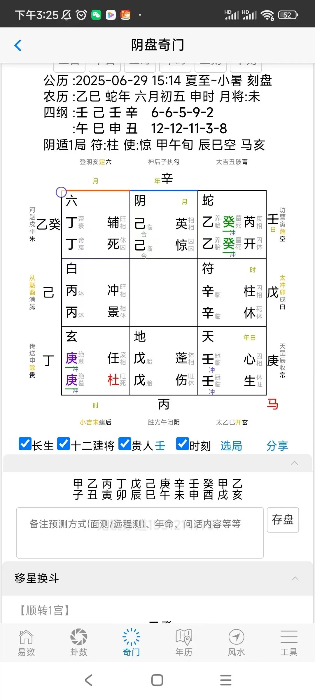②奇门阴盘时家,刻家排盘,盘面除奇门内容,还可以显示长生,十二建将,贵人,时刻等相关信息,大运等内容。有详细的移星换斗,神,星,门,干,八卦,十二长生,天门地户,飞星入斗等参考信息。