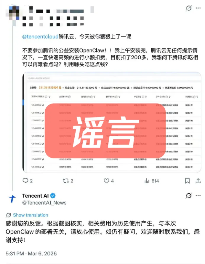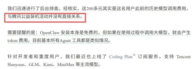 随后,腾讯云后台迅速排查后,给出了非常明确的结论:这200多元是该用户此前的历史模型调用费用,与腾讯公益装机活动和OpenClaw部署无关,OpenClaw安装本身完全免费,零门槛、无隐藏收费!