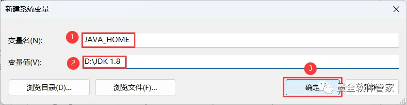 15、变量名输入:JAVA_HOME;变量值输入:D:\JDK 1.8(注意:变量值取决于JDK的安装位置,步骤6可查看),再点击【确定】
