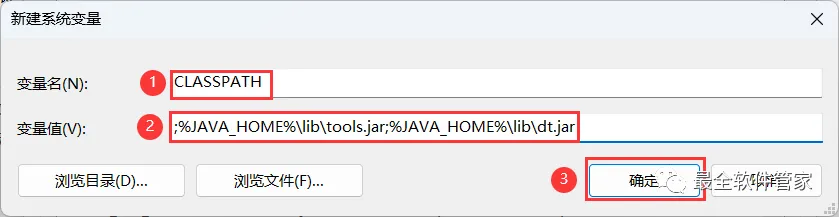 17、变量名输入:CLASSPATH;变量值输入:;%JAVA_HOME%\lib\tools.jar; % JAVA_HOME%\lib\dt.jar,再点击【确定】