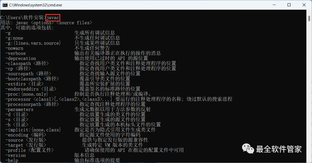 25、输入:javac,按下键盘上的【Enter】回车键,得到下列反馈,则JDK安装及配置成功