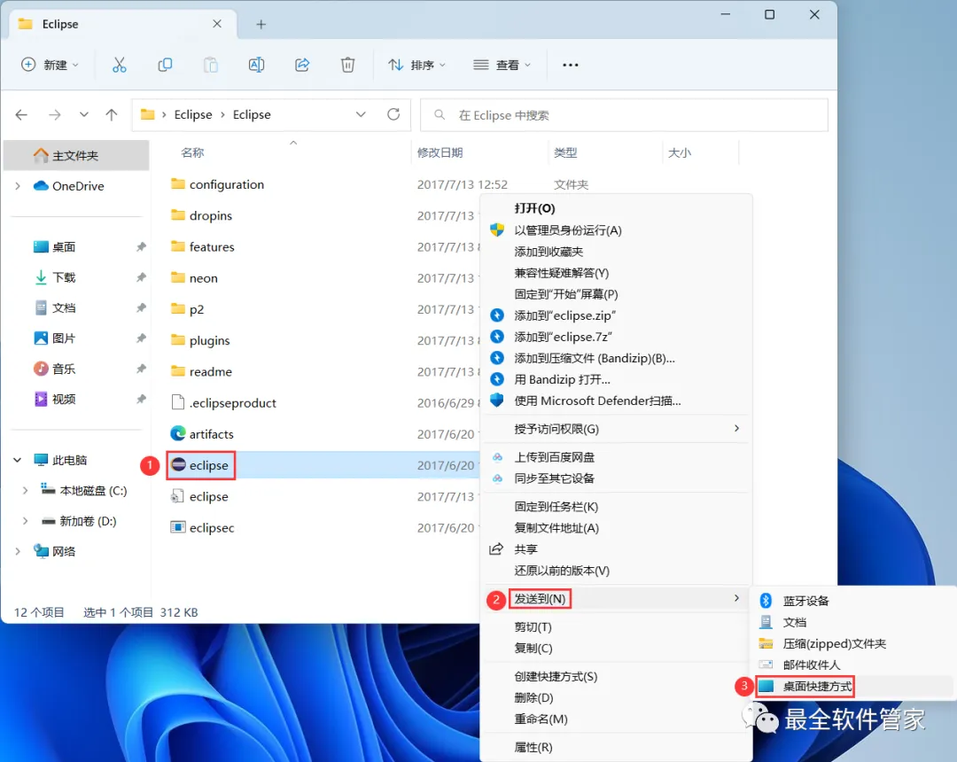 27、找到【Eclipse】应用程序,右键依次点击【显示更多选项】、【发送到】、【桌面快捷方式创建】,完成Eclipse软件桌面快捷方式的创建