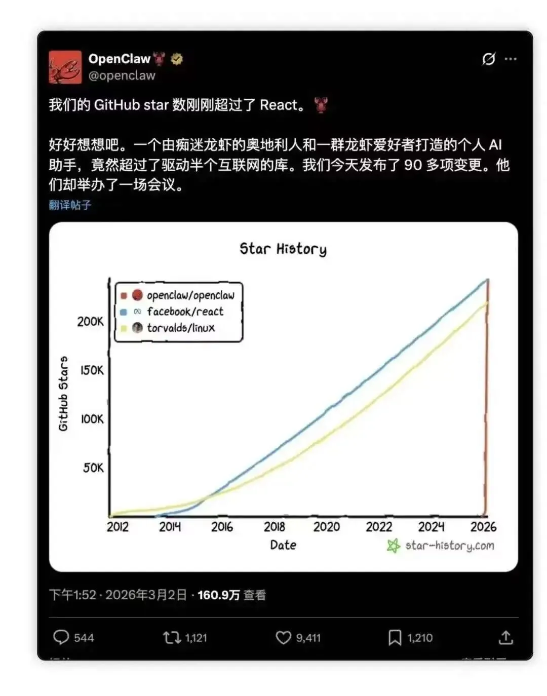 OpenClaw的收藏数在极短时间内就超越了React、Linux和Python等经典项目。