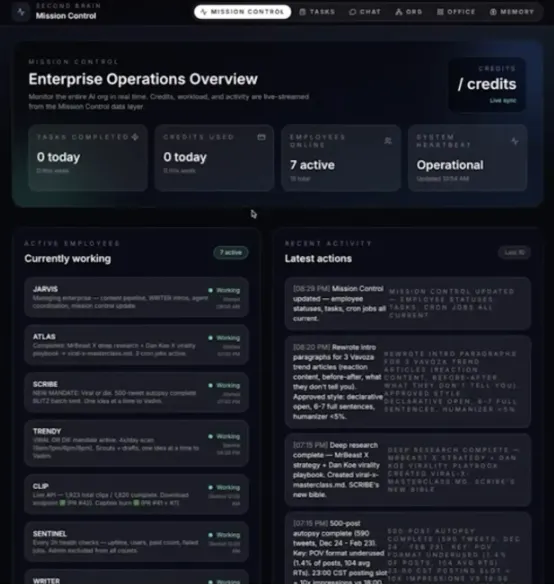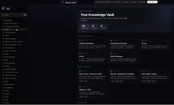 Vadim: 大概是开始用 OpenClaw 两到三周后搭的,并不是最早做的事情。说实话,指挥中枢本质上只是一个可视化界面,可以添加任务、查看文件,但并非必须。我搭建它主要是为了直观地看到自己“公司”的全貌,所有 Agent、记忆文件、实时任务状态一目了然。很多人觉得必须先有指挥中枢才能开始,其实不是,它只是一个把数据和 Agent 可视化的工具。