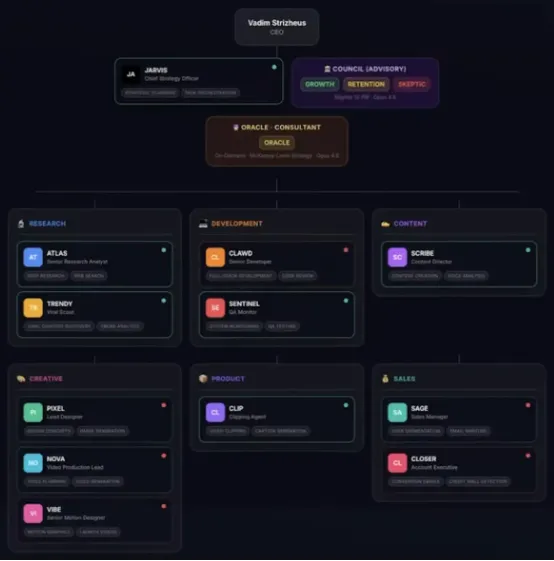 Vadim: 主要是为了清晰可视,同时我也想真正搭建起部门结构,而不只是一堆独立的 Agent。以开发部门为例:Clawd 是我的高级开发者,负责编写和构建代码;代码写完后会交给 Sentinel 做代码审查。Sentinel 不只检测用户端的 Bug,也负责审核 Clawd 提交的代码。Clawd 在运行 Claude Code 时本身会自我检查并迭代,但在提交 GitHub Pull Request 之前,我还额外设置了一个安全过滤层,由另一个大语言模型再做一轮审查。