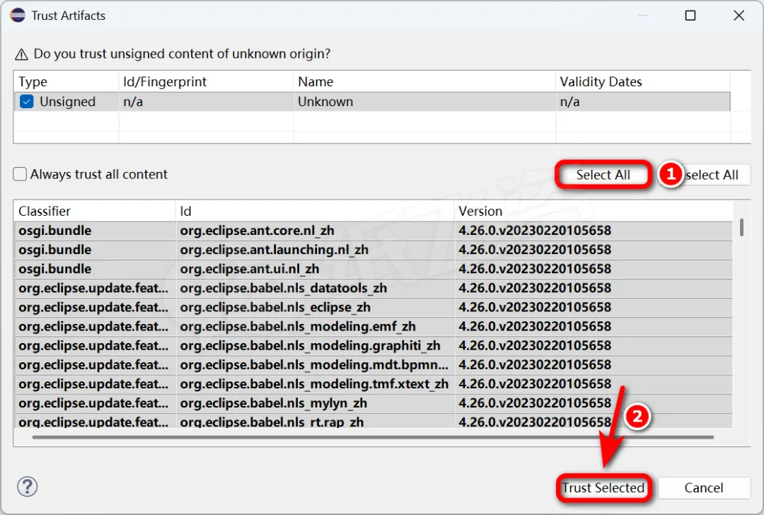 16.勾选[Unsiged],点击[Select All],点击[Trust...]