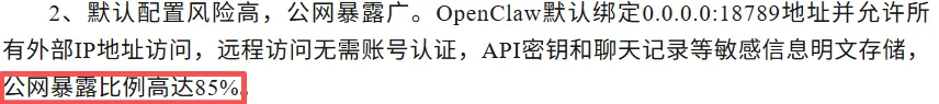 公网裸奔占比85%:默认监听0.0.0.0:18789,无任何身份认证,黑客全网扫到端口就能直接接管; 权限完全失控:默认以root运行、开启特权容器、随意挂载宿主机 /etc、 /var/run/docker.sock 等敏感目录,等于把服务器管理员权限拱手送人; 信任边界模糊:无任何网络隔离,容器一旦被攻破,可自由访问内网数据库、代码仓库、业务API,横向渗透如入无人之境; 全链路无审计:用户输入的提示词、AI执行的命令、插件调用的API、下载的文件……全程无日志、无告警、无追溯; 供应链风险极高:第三方社区插件中10.8%含恶意代码(引自国家预警原文),无白名单管控,一次简单的提示词注入就能绕过所有权限限制。
